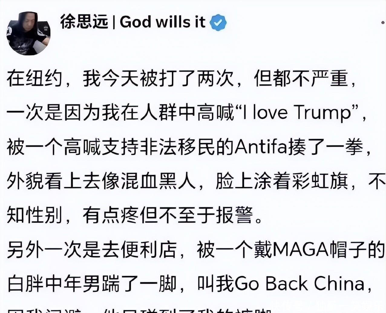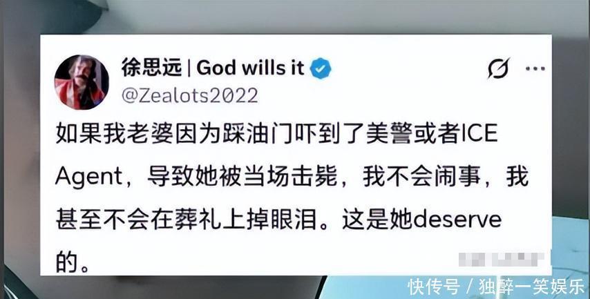 这样以我为名的后代的基因就会改变。”他还说,自己不像“东大人”那么在乎DNA,那是“狭隘思想”——为了所谓的“基因”,居然怂恿老婆出轨,这种想法,简直刷新了人类的底线。一周前,徐思远又出来蹦跶了,发了一个动态,说要是老婆因为踩油门吓到美警或ICE被击毙,自己既不会闹事,葬礼上也不会掉泪,因为这是她自找的。这言论已经让人找不到任何词语,来形容他的无耻和恶心了,实在替他妻儿感到悲哀,跟着他受苦就算了,还有可能随时成为他表忠心的牺牲品。