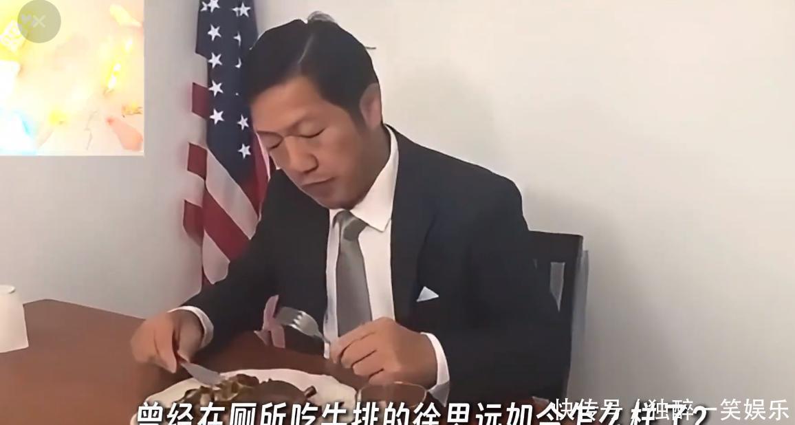 徐思远翻出了自己压箱底的西装,那西装早就皱皱巴巴的,上面还有不少污渍,他却穿得整整齐齐,正襟危坐在马桶上。他的身后,挂着一面巨大的星条旗,一看就是廉价买的,边缘都卷了边;手边放着一卷打折买来的卫生纸,露在外面一半;面前摆了一个小小的桌板,上面放着一块牛排——那牛排看起来又薄又小,还半生不熟的,估计是超市里最便宜的那种。这张照片一传到网上,瞬间就火了,成了中文互联网的“传世经典”。网友们看了之后,纷纷调侃:“穿着西装在厕所吃牛排,也就他能想出来了。”